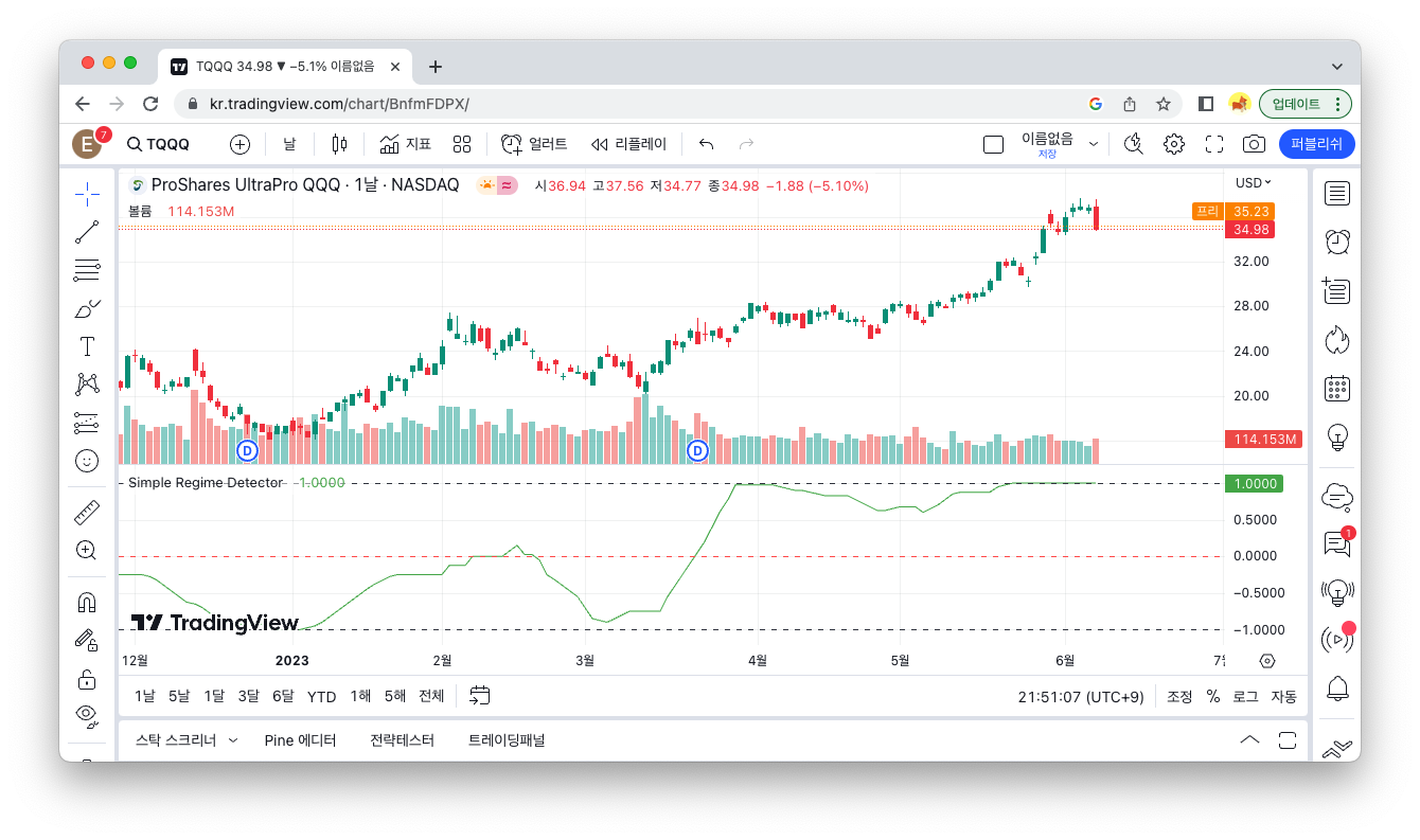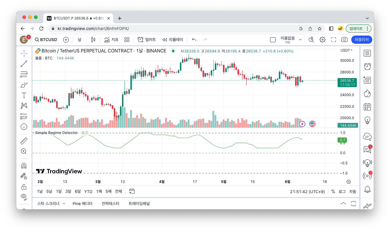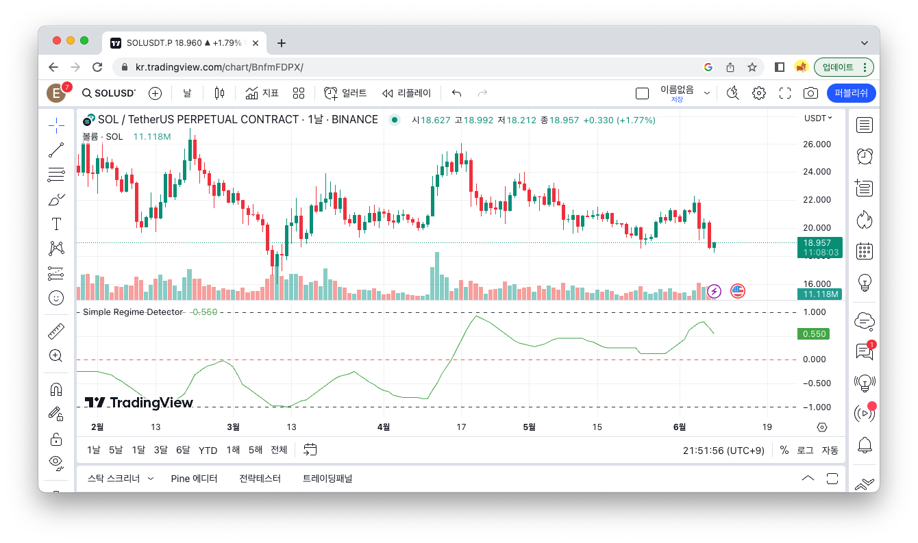 - `indicator("Simple Regime Detector")`: 이 줄은 지표의 이름을 "Simple Regime Detector"로 지정합니다.