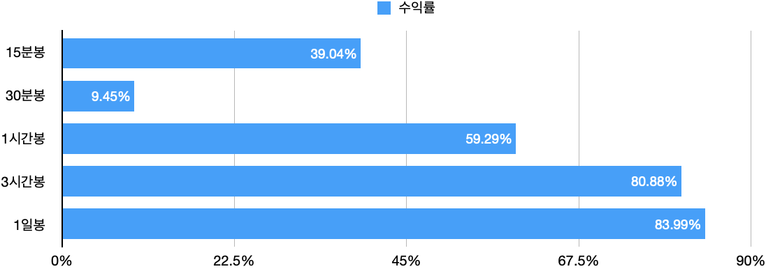 1일 봉에서 단, 4건의 거래를 통해 총 83.99%의 수익률을 발생되었습니다. 또한 3시간 봉에서도 55건의 거래로 80.88% 수익이 발생되었습니다. 모든 시간 봉에서 수익이 발생되었습니다.
