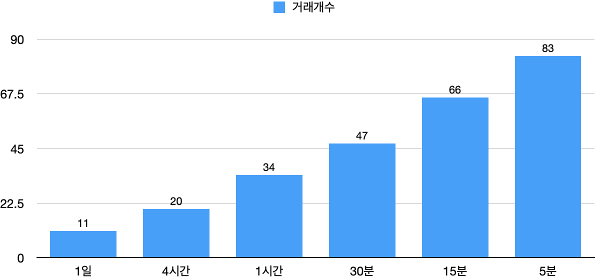 위 표에서 보시면 다른 그리드 거래처럼 시간 봉이 짧을 수도록 (1일 ⇒ 4시간 ⇒ 1시간 ⇒ 30분 ⇒ 15분 ⇒ 5분) 동안 수익률이 높고, 거래 개수도 많았습니다.