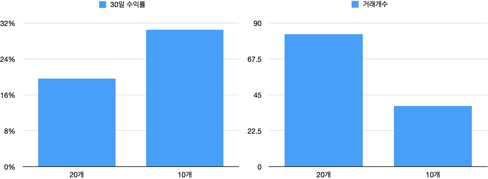 10개 그리드 (그리드 간 간격 6%)가 20개 그리드 (그리드 간 간격 3%) 보다 거래 개수가 낮으면서도 훨씬 수익률이 높음을 확인할 수 있습니다.