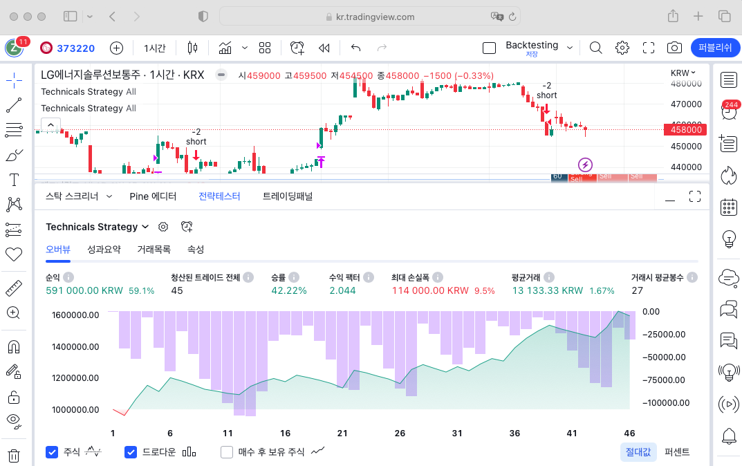 LG에너지솔루션에서 1시 봉 기준으로 +59.1%이 발생됨을 확인할 수 있습니다. (초기자본금 100만원, 오더사이즈 100만원)